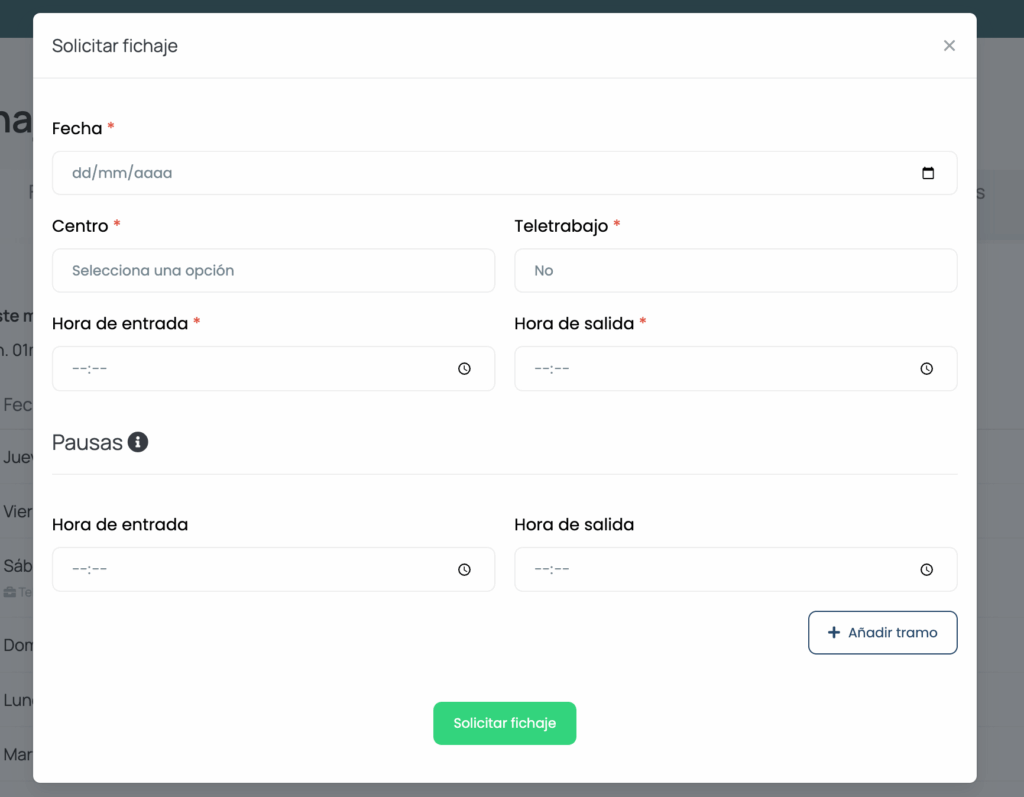 Ir a Fichar > Solicitar fichaje y registrar la jornada realizada.
